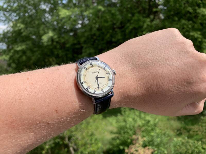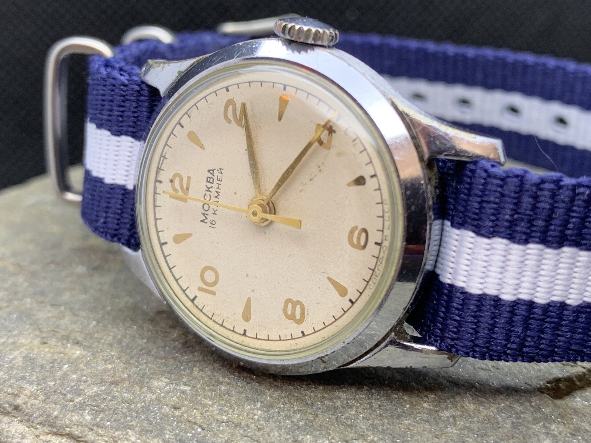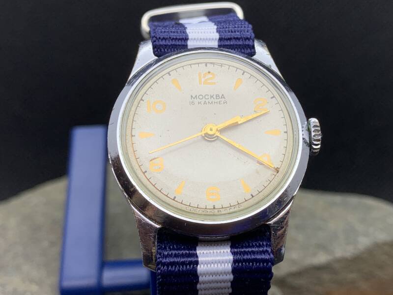 Dit kleine mechanische Moskva CCCP-horloge leent zich prima voor een Navy-strap. €50,-(Verkocht)