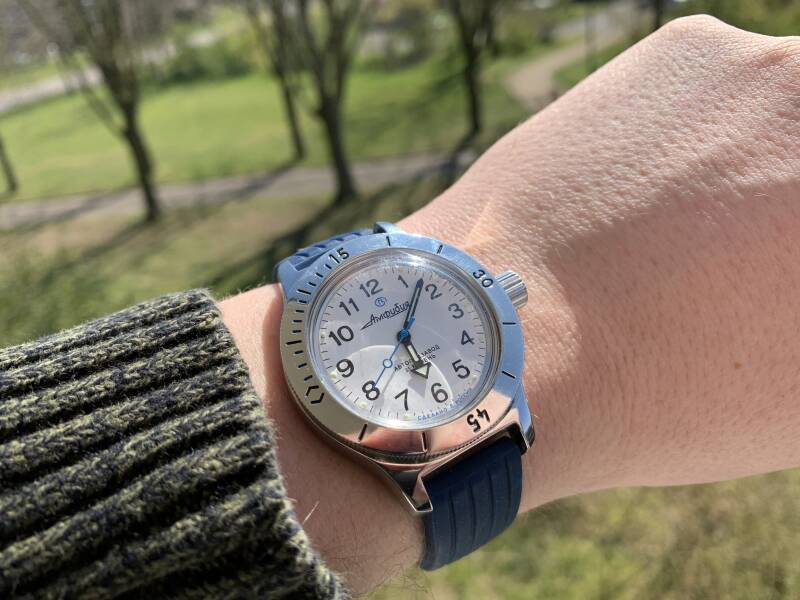 Zim Pobeda CCCP-horloge, 34mm, met blauwe wijzers op een bijpassende blauwe band. €25,-