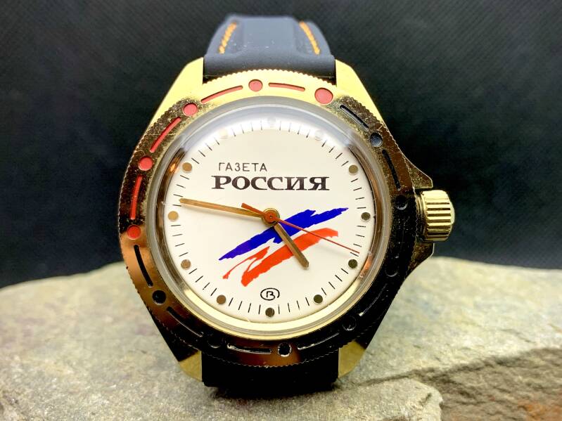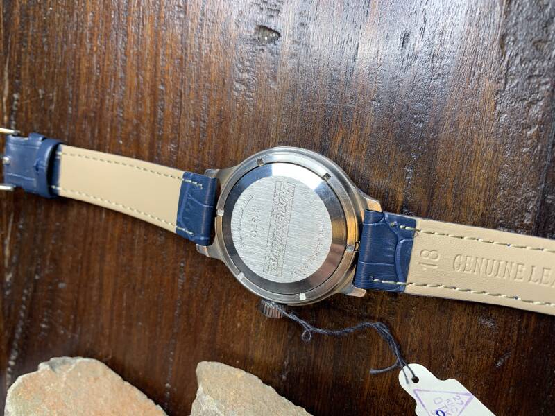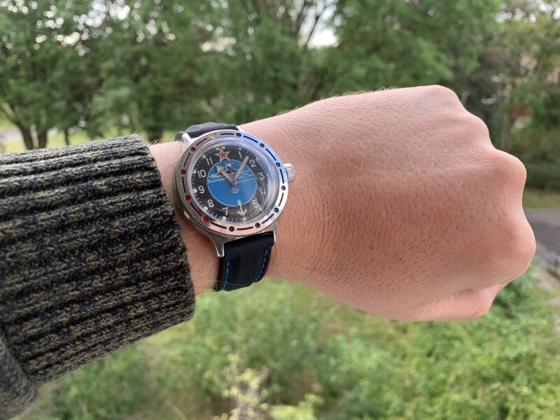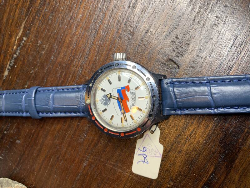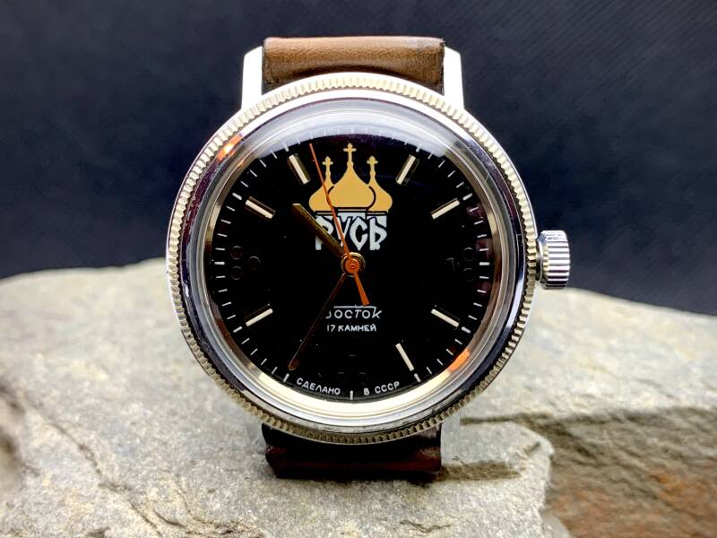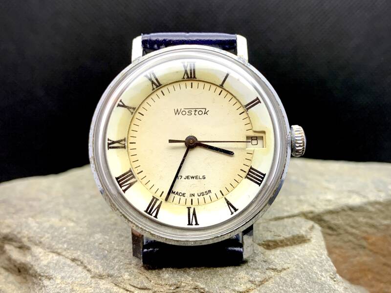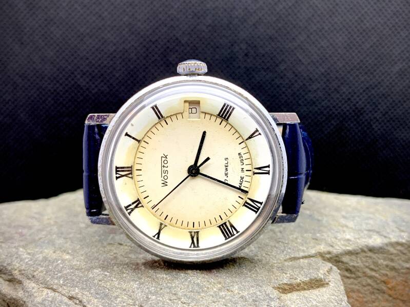Dit Vostok horloge is uit onze eigen tijd, maar wat is hij mooi. Er zit een extra zwarte band bij. €115,-