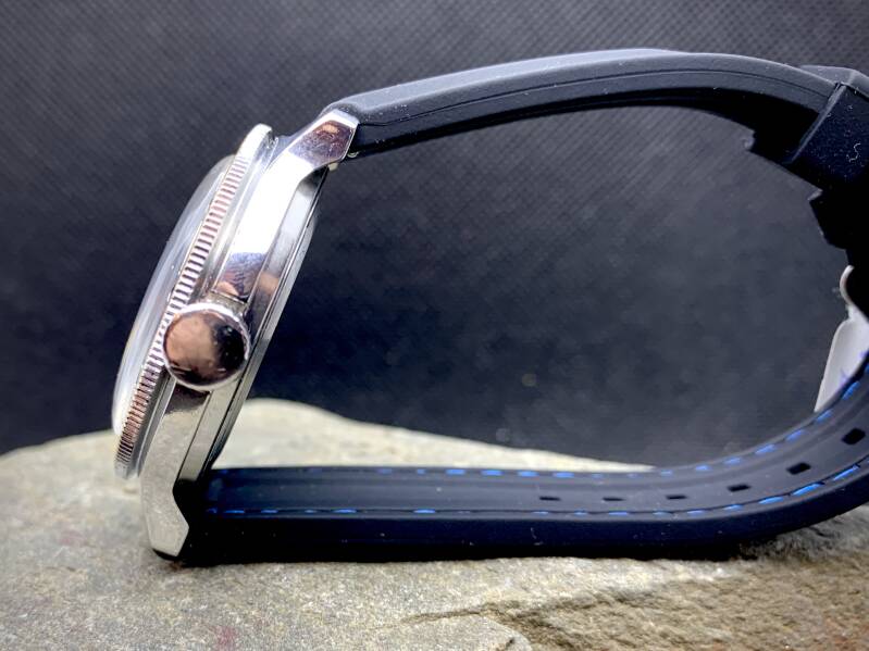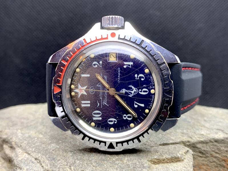 Oude Vostok met craquelé dial, persoonlijk meegenomen uit Oekraïne. Op een bijpassende rubber strap (easy -click springbar) met rood stiksel. €85,-