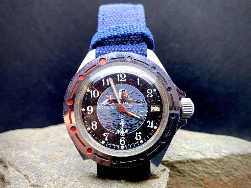 Vostok Kommandierski, datumaanduiding, op een bijpassende katoenen strap. €85,-