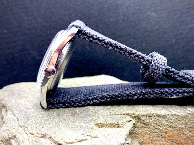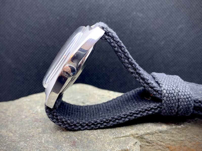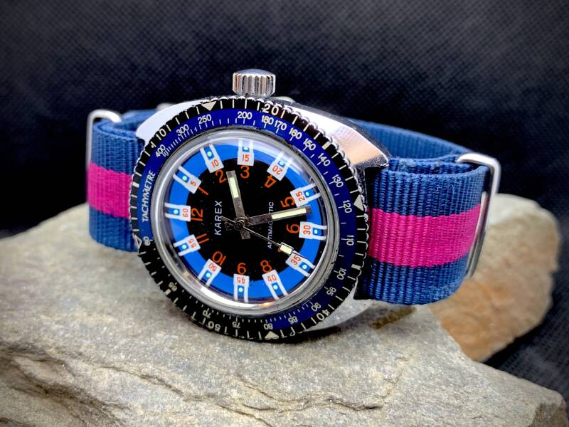 Karex mechanisch duikhorloge, 37mm uit de jaren 70. Met een tachymetre bezel op een bijpassende nato strap. Mainspring is recent vervangen. €150,-