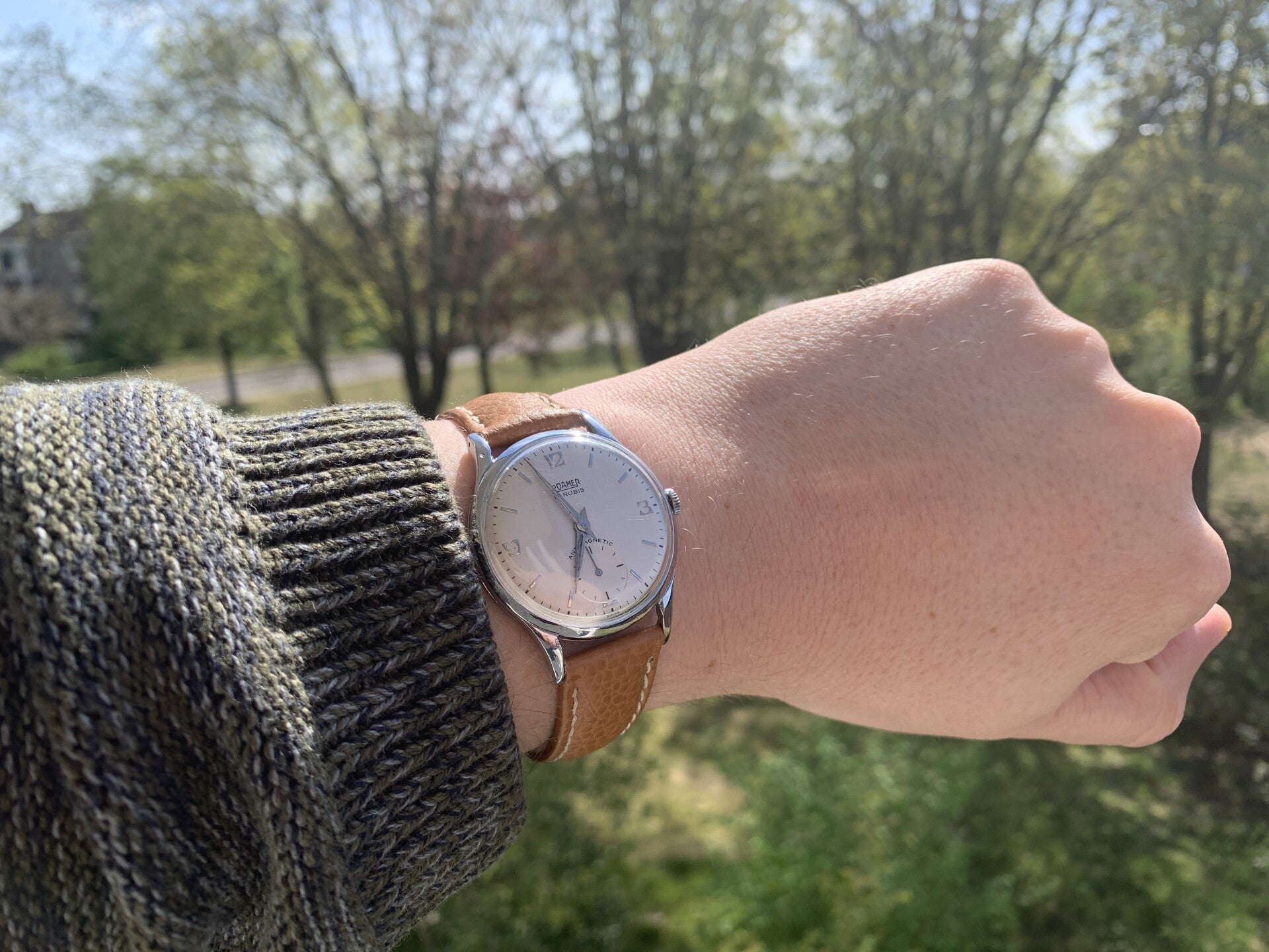 Military-stijl vintage Roamer uit de jaren 50. Zijn gebruikssporen maken hem des te interessanter.€65,-