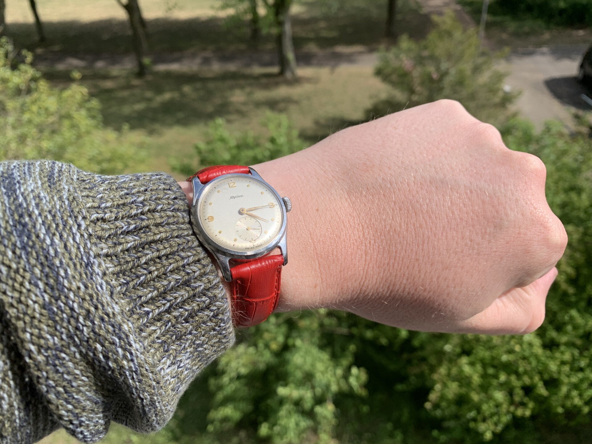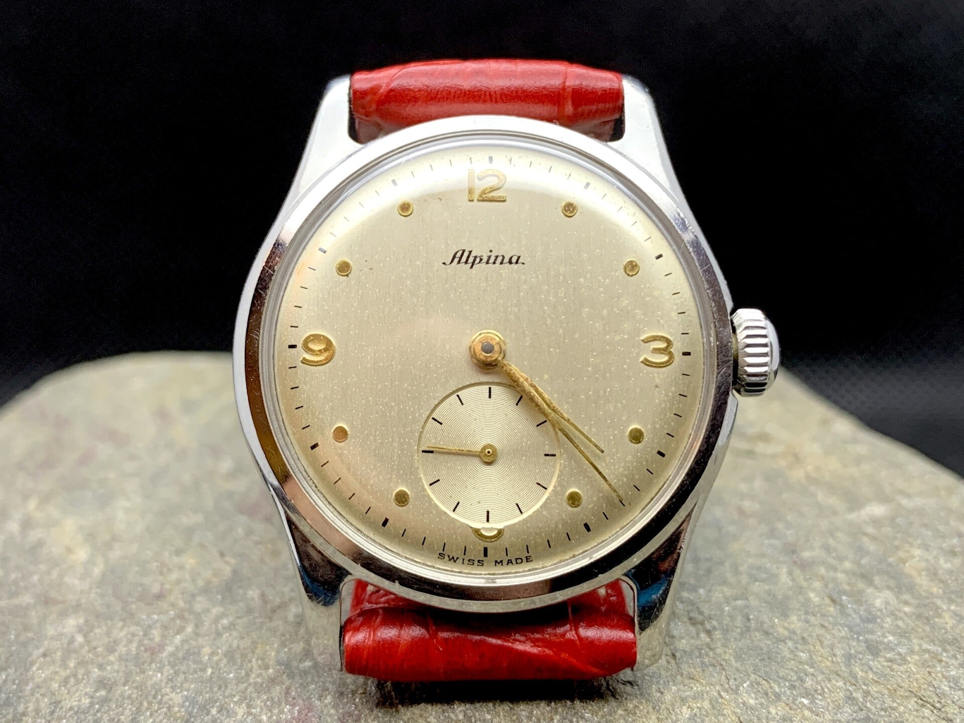 Met zijn 32,5mm is deze frisse Alpina (uit de jaren 50) klein, maar zeer fijn! Heeft een cal. 586 in-house movement. Op een opvallende rode band. €275,-
